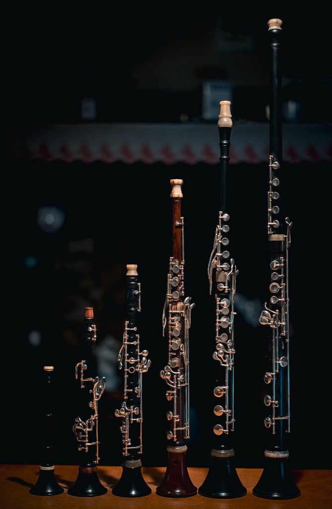 La photo ci-contre, montre l’amplitude des différentes bombardes utilisées et créées. Comme pour le saxophone par exemple, il existe désormais, grâce aux innovations et au savoir faire de l’atelier Hervieux, des bombardes baryton, ténor, alto, soprano et même sopranino.